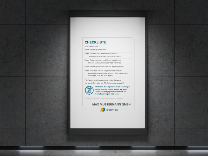 Mit der IDENTICA Checkliste haben Ihre Kunden schon beim Betreten des Werkstattbetriebs alle To-dos für den nächsten Termin im Blick. Das erleichtert nicht nur die Vorbereitung, sondern auch Ihre Arbeit: Sie können schneller loslegen, Rückfragen reduzieren und den gesamten Ablauf deutlich beschleunigen. So bleibt mehr Zeit für das Wesentliche – und das Fahrzeug ist in kürzester Zeit wieder einsatzbereit.